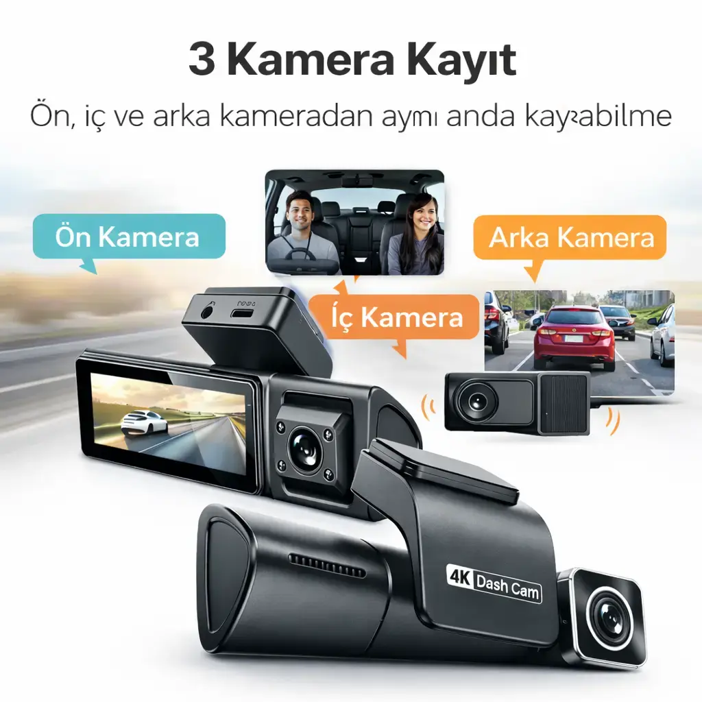 4K Araç Kamerası 3 Kamera Wifi Gps Gece Görüşlü arayan kullanıcılar için geliştirilmiş bu 3 kanal dash cam çözümü; ön, iç ve arka kameradan aynı anda kayıt alarak sürüş güvenliğini üst seviyeye taşır. Ön kamera 4K netliğiyle yolu, iç kamera 1080P çözünürlükle araç kabinini, arka kamera ise 1080P çözünürlükle arka trafiği eş zamanlı olarak kaydeder.