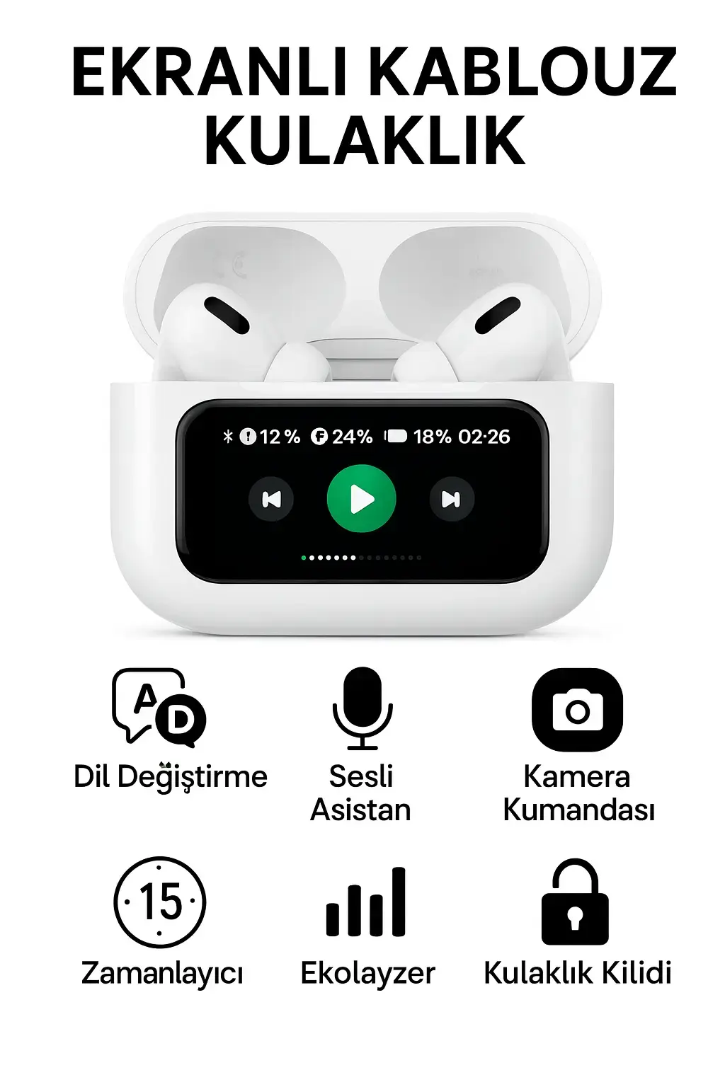 Bubitechh Ekranlı Kablosuz Bluetooth Kulaklık, yenilikçi dijital ekranlı şarj kutusu ve dokunmatik kontrol özellikleriyle müzik deneyiminizi bir üst seviyeye taşır. Modern tasarımı, yüksek ses kalitesi ve güçlü pil ömrüyle hem işte hem sporda mükemmel bir kullanım sunar.