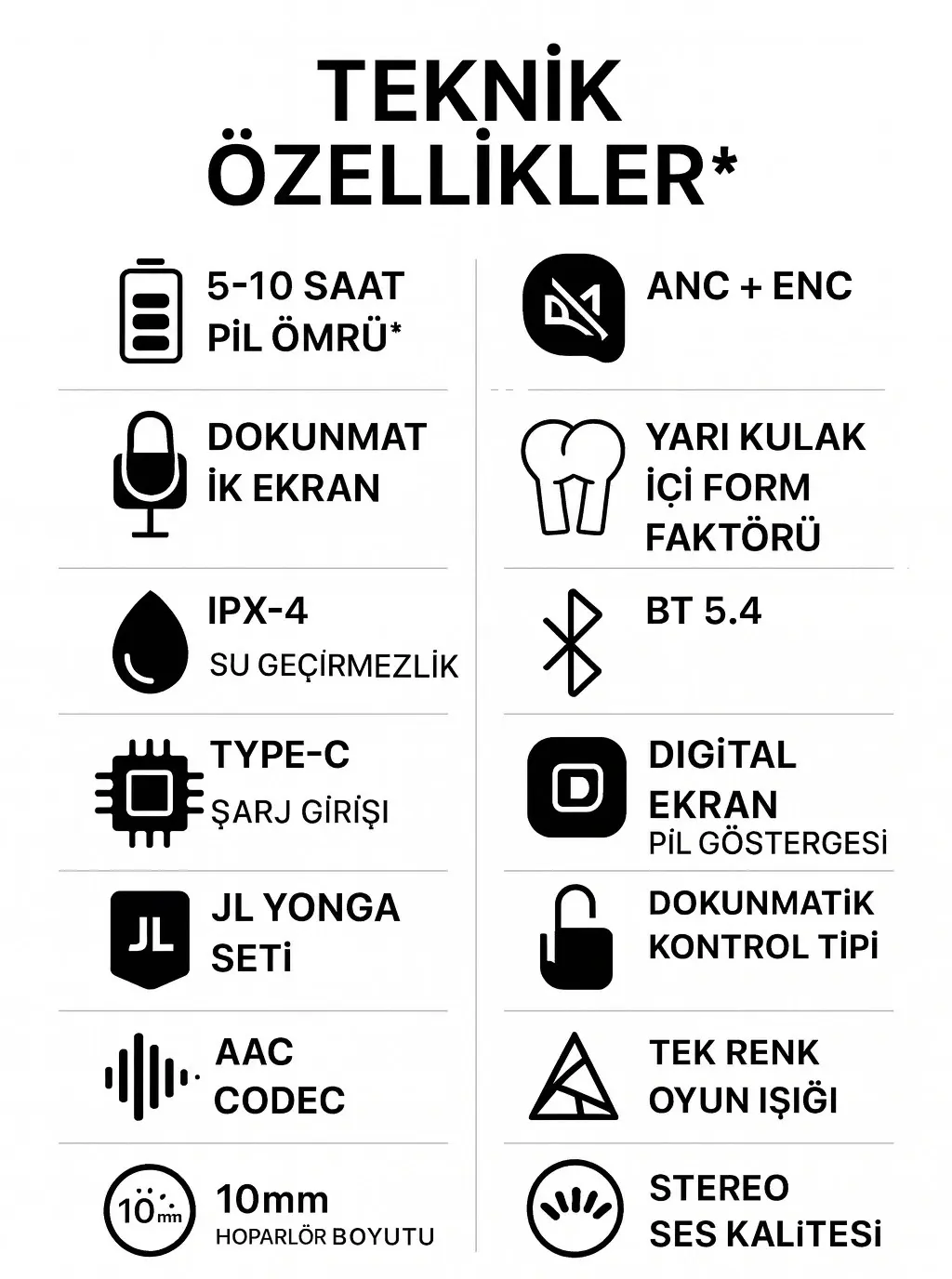 - ANC + ENC Gürültü Engelleme: Aramalarda ve müzikte net ses deneyimi.