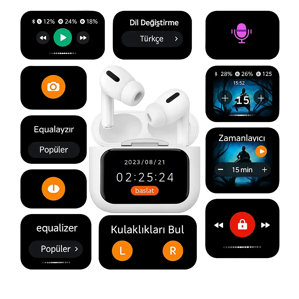 - Şarj Durumu: L/R kulaklık ve kutu pil göstergesi