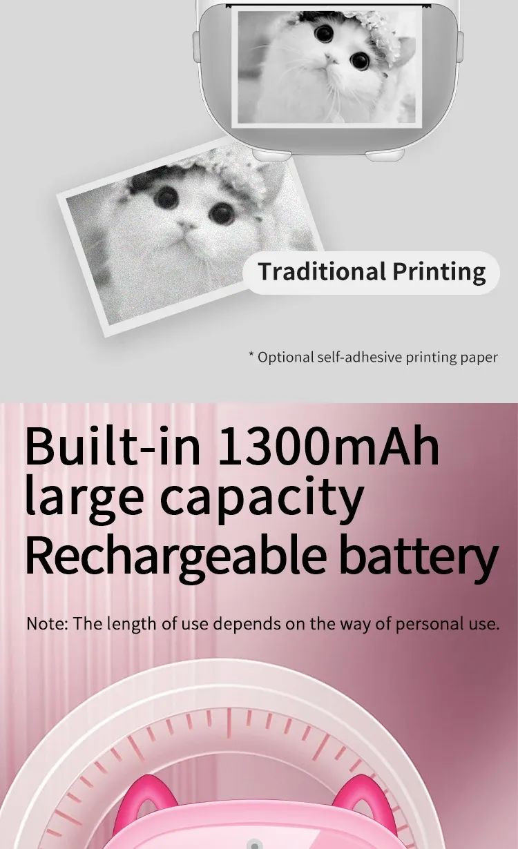 Çocuk Print Kamera - 1080P HD Çift Kamera ve Termal Yazıcı Bu çocuk fotoğraf makinesi özel olarak küçük eller için tasarlanmıştır. Zararsız plastik malzemelerden üretilen kamera, çocukların güvenli bir şekilde kullanabileceği köşeli olmayan yumuşak hatlar içerir.