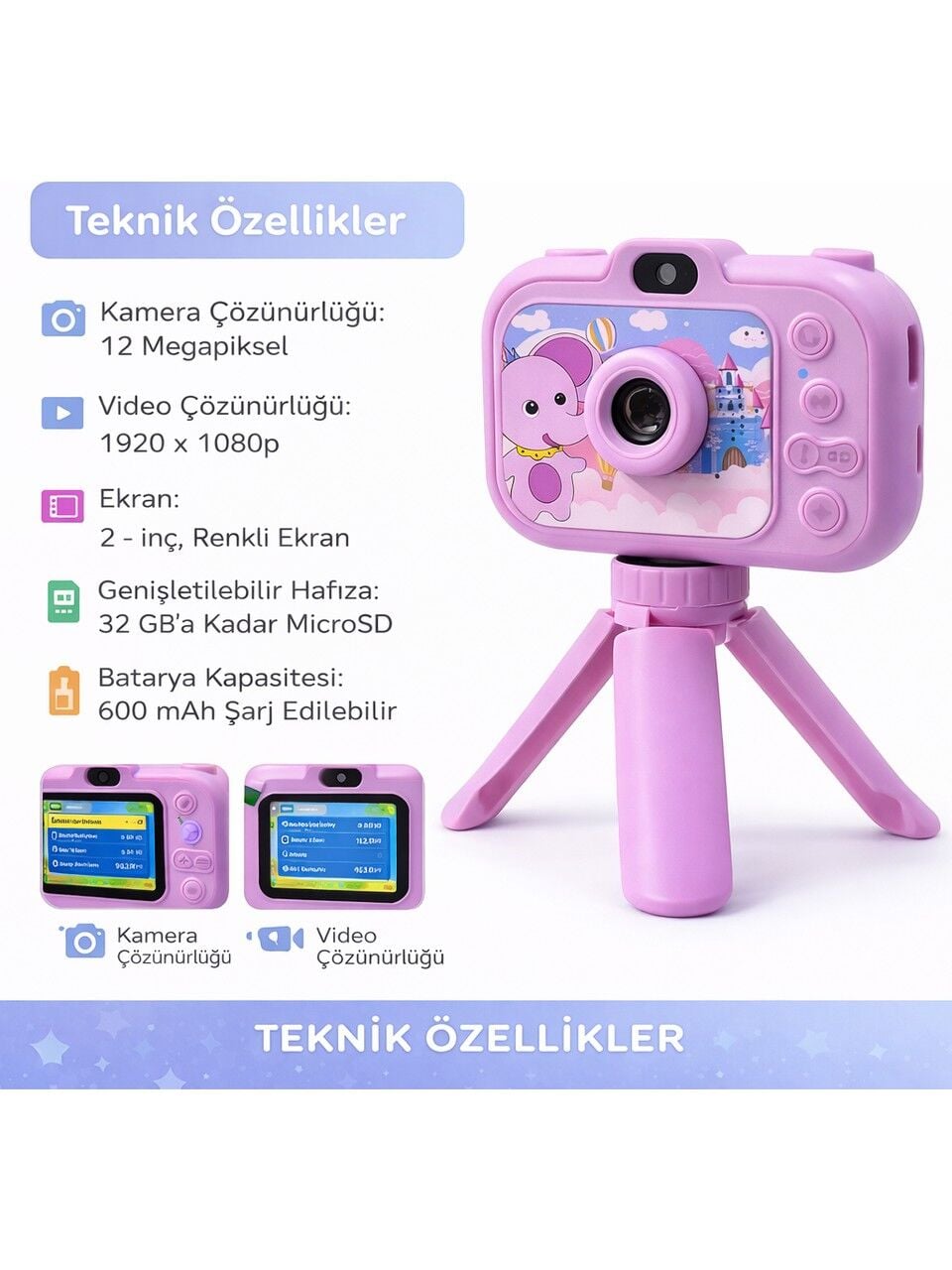 Çocuklar için özel olarak tasarlanan bu dijital fotoğraf makinesi, eğlenceli görünümü ve kolay kullanımıyla minik kullanıcıların keyifle fotoğraf ve video çekmesine olanak tanır. Hafif yapısı sayesinde çocukların ellerine rahatça uyum sağlar ve günlük kullanım için pratik bir deneyim sunar.