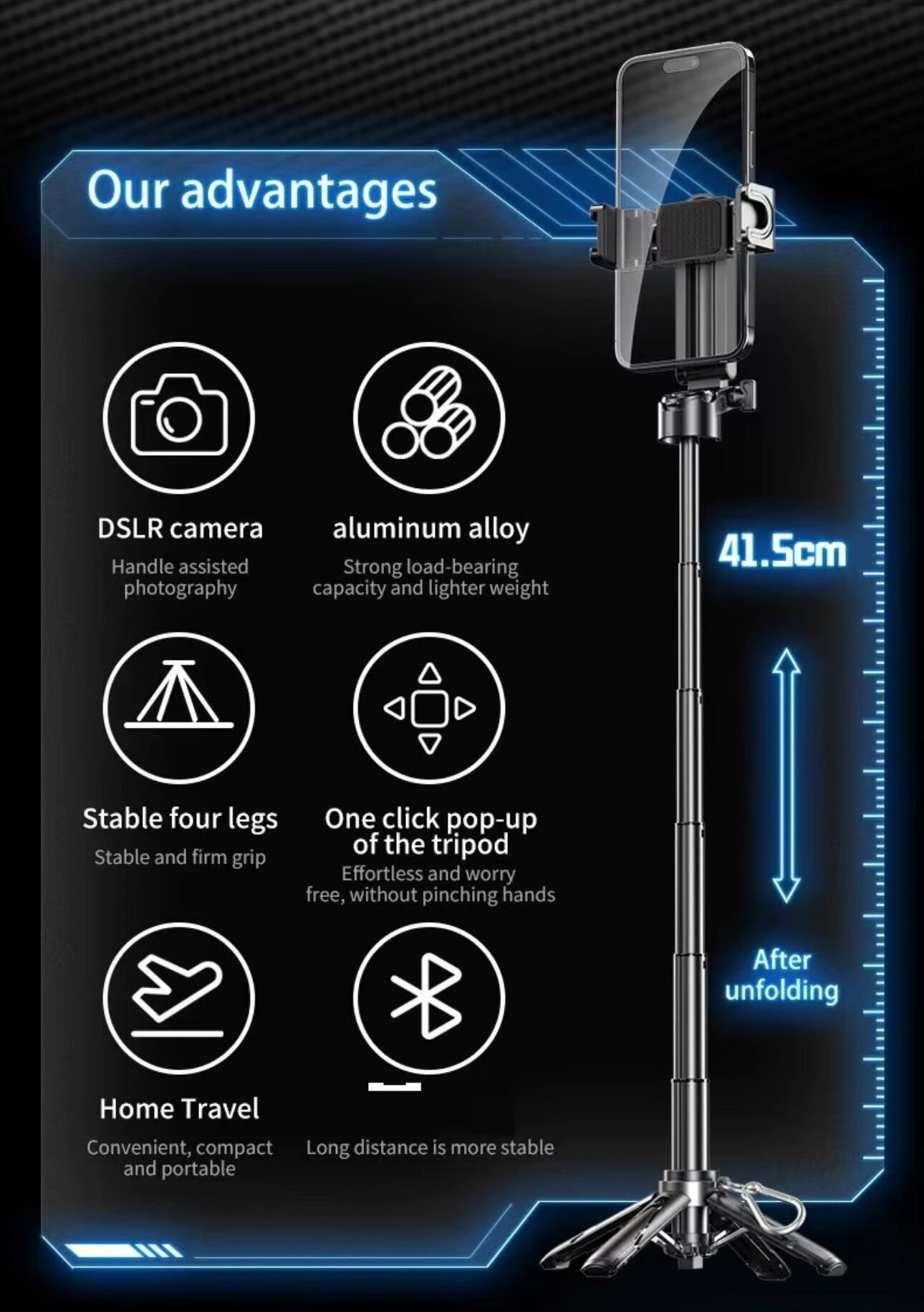 Selfie Çubuğu Mini Telefon Tutucu Tiripod Katlanabilir dört bacaklı tripod sistemi, zeminle güçlü temas kurarak cihazınızın sabit kalmasını sağlar. Üzerindeki tek tuşla açılabilir mekanizma, ürünü saniyeler içinde kurup kullanmaya başlamanıza olanak tanır.